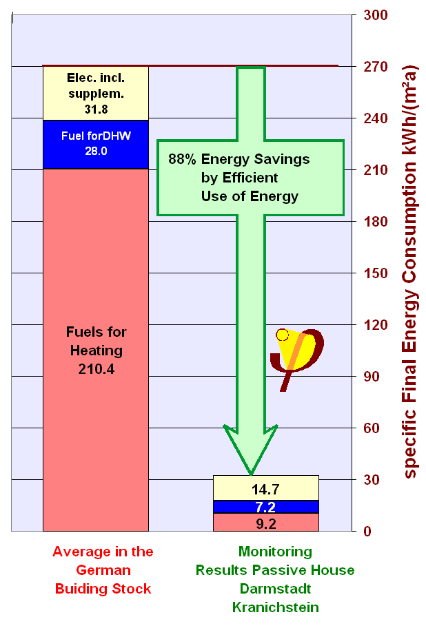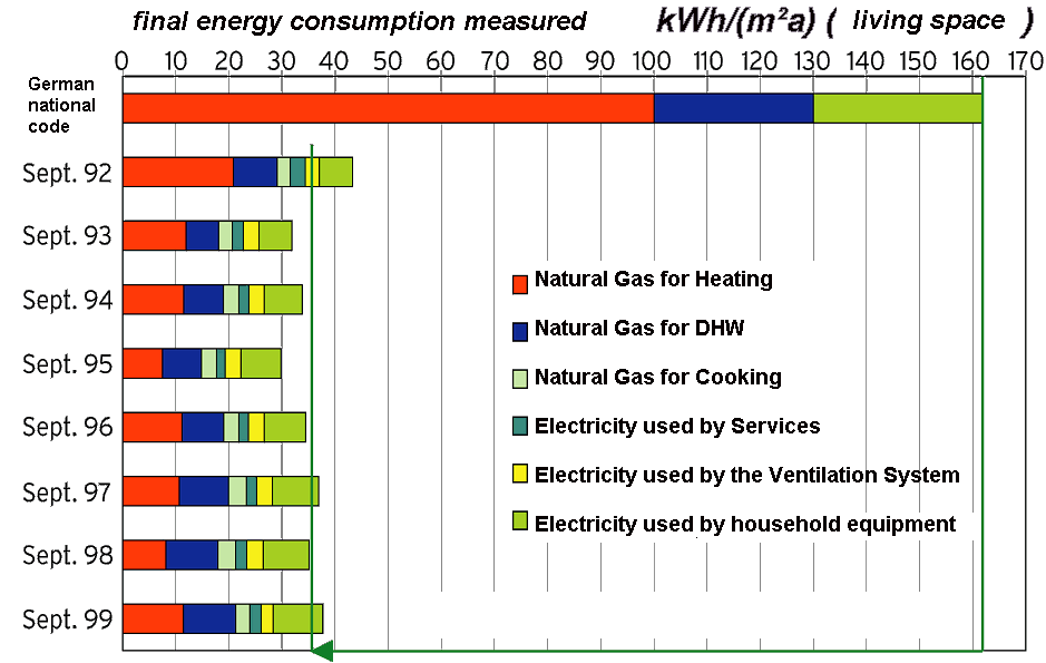 The measurements in the Passive House in Darmstadt Kranichstein confirmed: With presently available technology, the electrical consumption for household appliances can be reduced to one third of it's current average value. The additional gas consumption for applications which need heat amounts to less than 15% [ Ebel/Feist 1997 ]. Also these savings due to efficient technology have been historically proven to be stable.