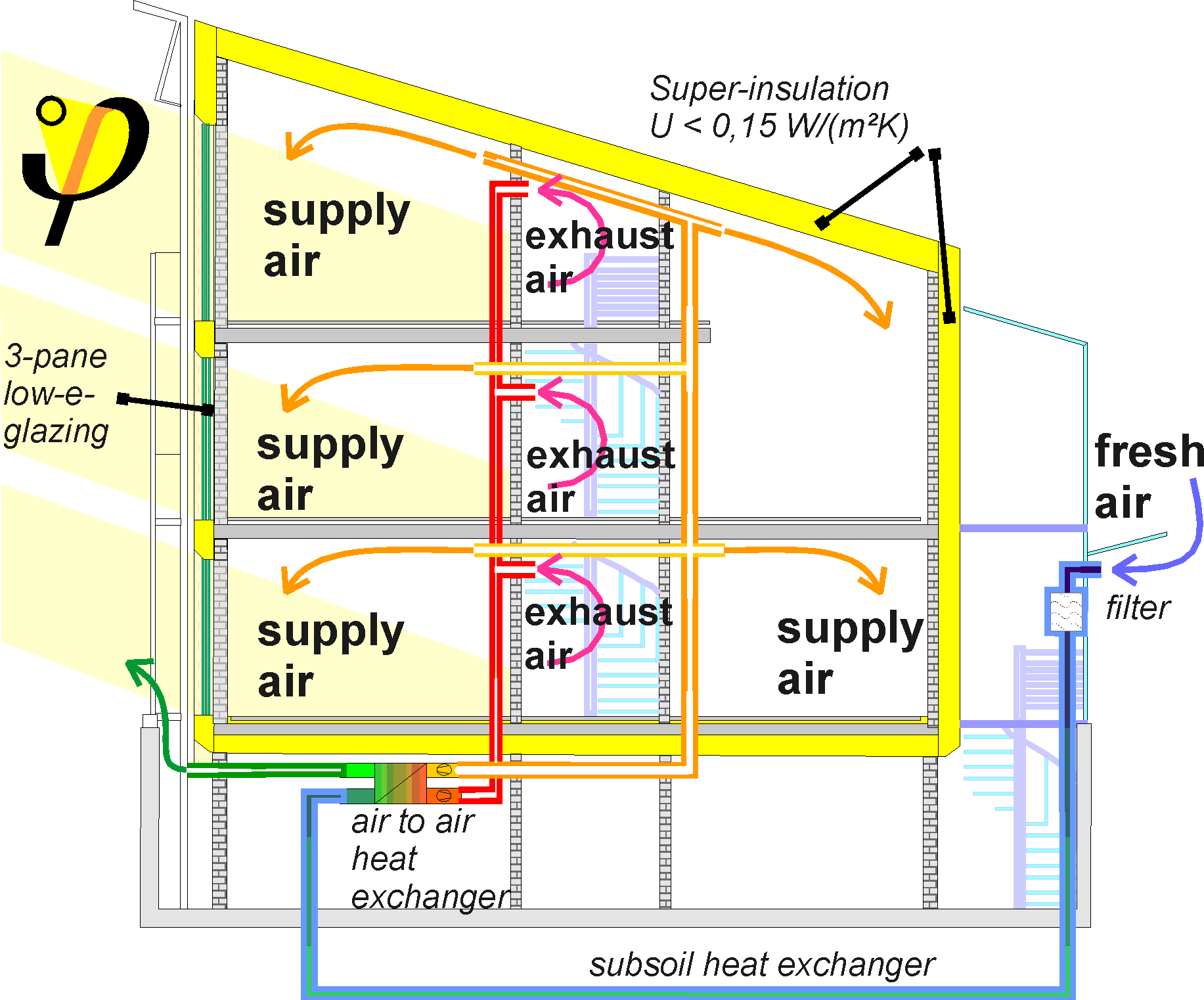 The emphasis of the Passive House design and construction is heat conservation: Thermal Insulation and heat recovery ventilation are the crucial components. That still applies to the Passive Houses built today. Beyond that a solar domestic hotwater system and a ground-coupled fresh air preheater were used. The house has an extremely good thermal insulation, which in the 16 years since occupancy, has worked outstandingly.