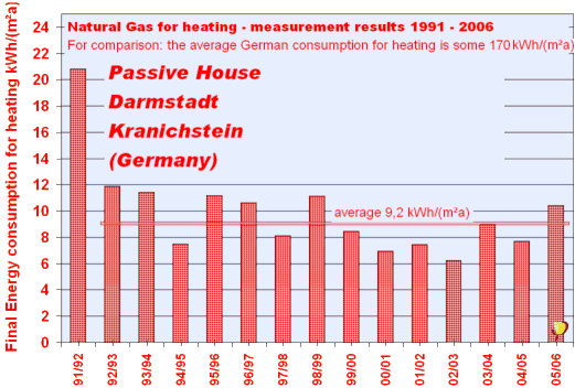 conservation was reached soley through improved technology. Even the icecold winter 1996/9, during which temperatures fell well below normal for several weeks causing comfort problems in many conventionally heated houses, it was always comfortable warm in the passive houses. Not only that, but heating energy consumption remained low (under 11 kWh/(m²a)) [ Feist 1997b ]. The first passive