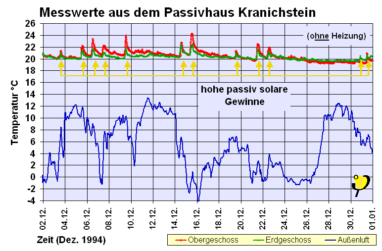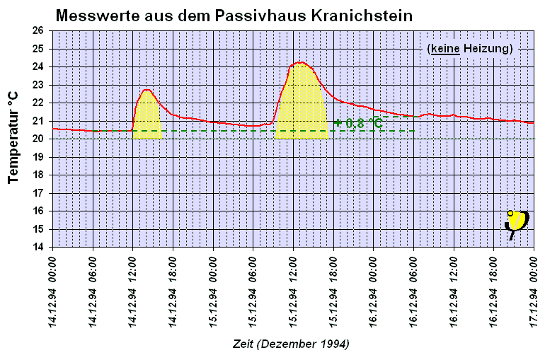 Nichts zeigt eindrucksvoller die Wirksamkeit der passiven Solarenergienutzung als Messwerte aus dem Passivhaus Kranichstein: Im Dezember 2004 war in diesem Haus keine Heizung im Betrieb. An den beiden sonnigen Tagen 14. und 15. Dezember gelangt durch die Verglasungen Sonnenenergie in den Raum (gelbe Phasen). Die Raumtemperaturen erhöhen sich sichtbar. Die innere Speichermasse des Hauses wird aufgeladen. Da die Wärmeverluste sehr gering sind, kann das Haus diese Wärme halten. Am 16. Dezember um 6:00 liegt die Temperatur 0,8 Grad über dem Wert vom 14. Dezember vor Beginn der Einstrahlung. Die folgenden Tage waren leider, wie so oft im mitteleuropäischen Winter, stark bewölkt. Trotzdem verliert das Haus auch ohne Heizung nur etwa 0,2 Grad je Tag.