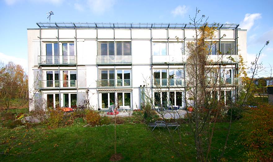 mit der gesamten Südfassade des Passivhauses Darmstadt Kranichstein