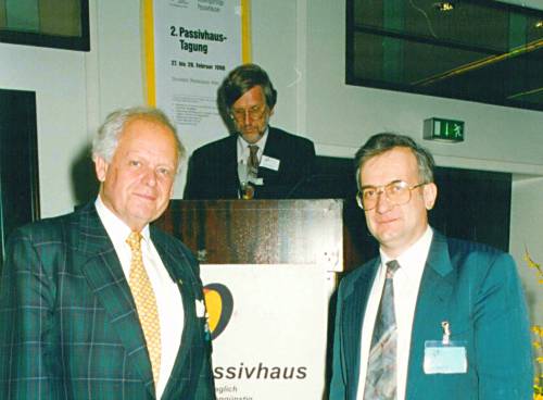 Mitte der 80er Jahre war das Niedrigenergiehaus in Schweden und Dänemark bereits gesetzlich geforderter Standard bei Neubauten. Schon damals gab es Überlegungen, die Prinzipien des Niedrigenergiehauses, nämlich hervorragender Wärmeschutz, Vermeidung von Wärmebrücken, Luftdichtheit, Wärmeschutzverglasung und eine kontrollierte Wohnungslüftung, weiterzuentwickeln. Auf diese Überlegungen aufbauend wurde das "Passive House" im Mai 1988 bei einem Forschungsaufenthalt des Autors an der Universität Lund/Schweden zusammen mit dem Gastgeber Prof. Bo Adamson (Fachgebiet Baukonstruktionslehre) aus der Taufe gehoben. Bo Adamson hat diese Entwicklung bis zu seiner Emeritierung gemeinsam mit dem Autor weiter verfolgt. Das Foto zeigt die beiden zusammen mit Robert Hastings, einem der amerikanischen Pionier-Architekten, bei einer Abendveranstaltung der 2. Passivhaustagung 1998 in Düsseldorf.
