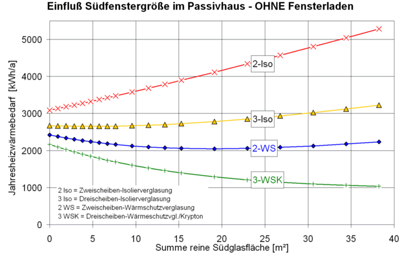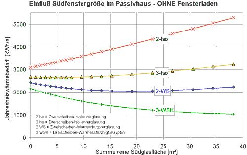 "Passive Häuser" wurden als Gebäude definiert, die auch im mitteleuropäischen Klima einen nur verschwindend geringen Heizwärmebedarf aufweisen und daher keine aktive Heizung mehr benötigen: Solche Häuser können dann allein mit den ohnehin vorhandenen inneren Wärmequellen und der durch Fenster eingestrahlten Sonnenenergie sowie einer geringfügigen Frischlufterwärmung, also "passiv", warm gehalten werden. Der theoretische Beweis für die Realisierbarkeit solcher Häuser wurde in der Dissertation "Passivhäuser in Mitteleuropa" mit Hilfe von rechnergestützten Simulationen des Energiehaushaltes von Gebäuden erbracht [Feist 1993]. Systematisch wurden in dieser Arbeit alle Eigenschaften von Bauteilen, die den Energieverbrauch von Gebäuden bestimmen, variiert und in Hinblick auf Effizienz, Kosten und Wohnwert optimiert. Die folgende Grafik zeigt beispielhaft ein Ergebnis zum Einfluss von Fenstergröße und Verglasungsqualität.