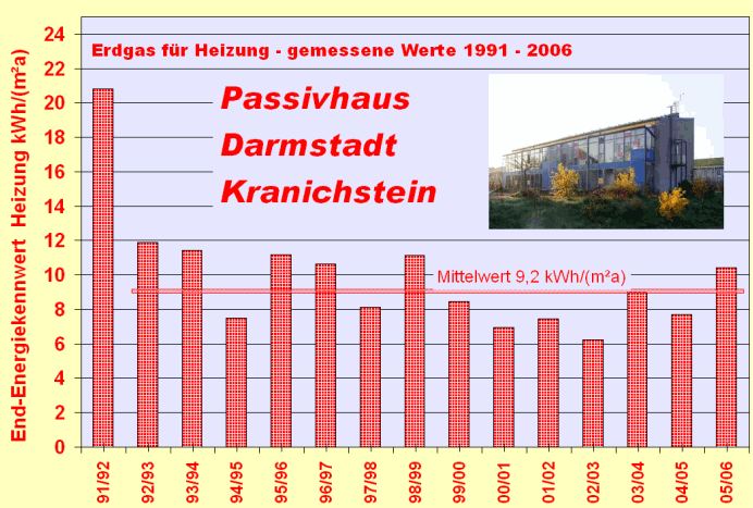 durch verbesserte Technik erreicht wurde. Selbst der eiskalte Winter 1996/97, in dem über Wochen die Normauslegungsaußentemperaturen deutlich unterschritten waren und in vielen konventionell beheizten Häusern Komfortprobleme auftraten, wurde vom Passivhaus problemlos gemeistert. Nicht nur der Heizenergieverbrauch blieb unter 11 kWh/(m²a), praktisch so gering wie zuvor, sondern es war auch in allen Wohnungen gleichmäßig komfortabel warm [Feist 1997b]. Das erste Passivhaus