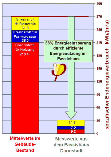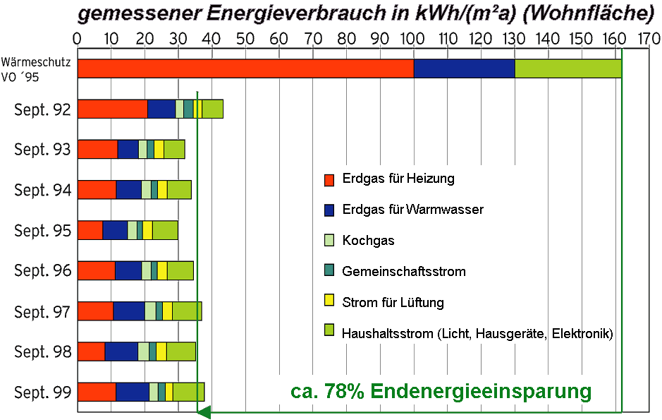 Die Messungen im Passivhaus in Darmstadt Kranichstein haben es bestätigt: Mit heute verfügbarer Technik lässt sich der Stromverbrauch für Haushaltsanwendungen auf ein Drittel des Wertes vergleichbarer Haushalte senken, der zusätzliche Gasverbrauch für Wärmeanwendungen beträgt dabei weniger als 15% [Ebel/Feist 1997]. Auch diese allein durch effiziente Technik erreichten Einsparungen erwiesen sich als über die Jahre stabil.