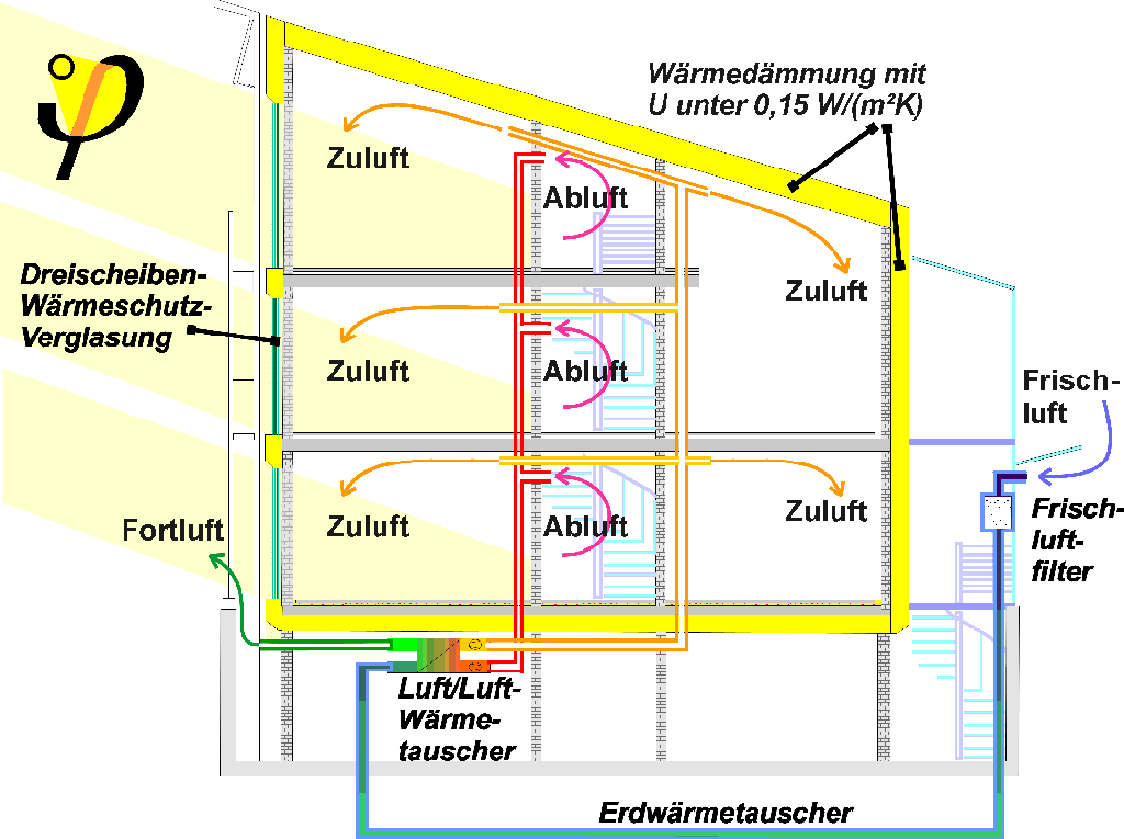Der Schwerpunkt der Maßnahmen liegt beim Passivhaus bei der Wärmebewahrung: Wärmeschutz und Wärmerückgewinnung sind die entscheidenden Komponenten. Das gilt auch heute noch für die in der Folge gebauten Passivhäuser. Darüber hinaus wurden Sonnenkollektoren für die Warmwasserbereitung und ein Erdreichwärmetauscher für die Vorerwärmung der Frischluft eingesetzt. Das Haus hat einen extrem guten Wärmeschutz, der sich in nun 15 Jahren seit dem Bezug hervorragend bewährt hat.