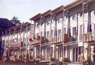 ![]() Passive House Darmstadt Kranichstein – the first Passive House, built in 1990. Four terraced houses in solid building, first use of insulated window frames. Architects: Prof. Bott /Ridder /Westermeyer. This building has been subject-matter of extensive measurements. The results have been published, including documentation of the building process, in the conference transcript of the first Conference on Passive Houses in 1996 (page 153-180). Documentation on the internet:15 Years of Passive House Darmstadt Kranichstein. This building has got an annual heat requirement of approximately 10 kWh/(m²a). Thereby being a one-litre-house, it was the first normally occupied building with such high energy efficiency. ![]() Single-family Passive House in Lindlar near Cologne. Architect: Manfred Brausem, built in 1998. On the whole, five Passive Houses have been built in this first estate of Passive Houses in North-Rhine Westphalia. One of the first realised free-standing single-family houses that were built according to the Passive House Standard. Mr. Manfred Brausem wrote a report for the 2nd Conference on Passive Houses in 1998 entitled „ Solar Passive Houses in modern timber construction“ ( p. 169-179). More information on this and other projects of M. Brausem available on the Internet at www.passiv-haus.de. ![]() The estate of Passive Houses in Wiesbaden made it possible to compare 22 Passive houses to 24 low-energy buildings on the same building site; a survey carried out by the Institut for housing and environment, Darmstadt (IWU). Folkmar Rasch had planned the estate which was realised in 1997. In 1999, at the third Conference on Passive Houses, first measurement results could already be presented by Tobias Loga ( p. 93-110). More information on the Internet: Passive Houses Wiesbaden.