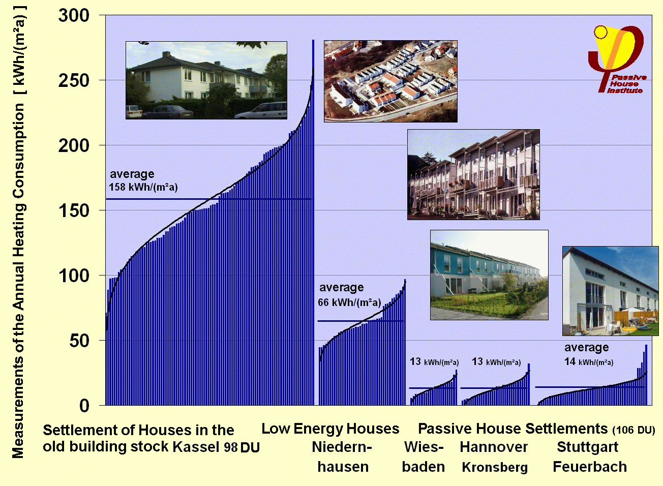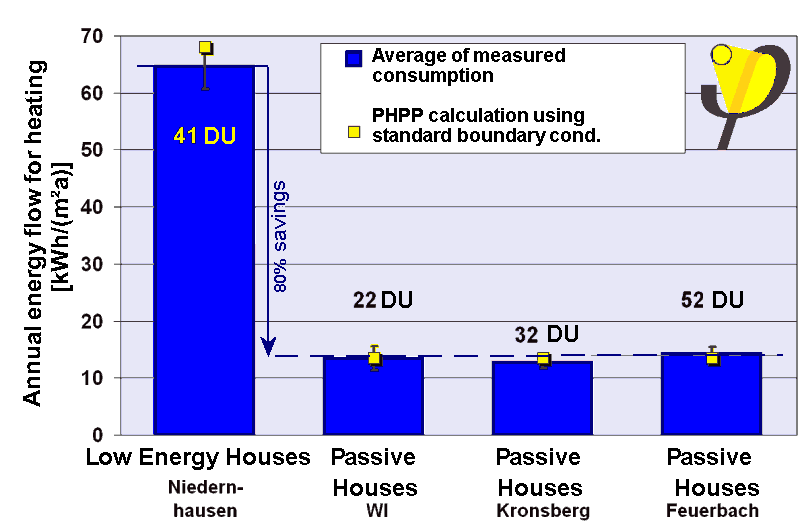 Fig. 6: This diagram summarizes the comparison of the energy consumption results of the low-energy development (left, 65 kWh/(m²a)) with the three Passive House developments (approximately 13 kWh/(m²a) in each case). The consumption in Passive House developments by measured results is about 80% less than in already very energy efficient low-energy homes. All field-measured and averaged results match closely the apriori ( in advance) calculated heat requirements using the Passive House Planning Package (PHPP). Conclusions The measurements in the realized passive house developments show: