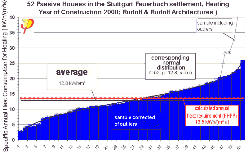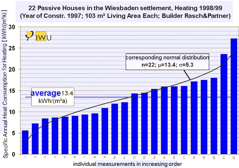 2. Heating season 2000/2001: 13,3 kWh/(m²a) 3. Heating season 2001/2002: 12,8 kWh/(m²a). Based on the measurement results, the extremely low heat consumption has also been statistically determined for the Passive House development in Hannover Kronsberg. The standard deviation of the individual values amounts to 6.6 kWh/(m²a), the average deviation is determined to be ±1.2 kWh/(m²a).