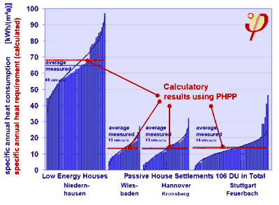 Summary Different users have, even if they live in identically constructed houses, frequently very different consumption results: Deviations of ±50% from the average consumption value are not exceptional. This is not only the case in houses constructed following the Passive House principles, but holds true for other construction types as well. This deviation is caused mainly by different thermostat settings during the heating season. Additionally, the maximum energy consumption in Passive Houses is still significantly lower than the lowest usage in average new buildings. As has been proven, the Passive House concept leads to very high energy savings, reproducibly, which amounts to more than 90% savings compared to existing buildings and to still on average 80% compared to the energy code requirements for new construction in Germany (which is quite good compared to other standards in the world).