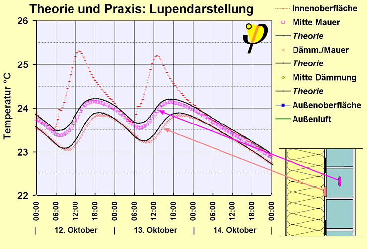 Wir fügen am Ende dieses ersten Beleges noch eine "Lupendarstellung" zur Grafik auf der Hauptseite ein, auf der die Temperaturverläufe in der gemauerten Wand hochaufgelöst zu erkennen sind (der Zeitraum ist exakt gleich). Bitte beachten Sie die hohe Temperaturauflösung: zwischen den durchgehenden und den gestrichelten horizontalen Gitternetzlinien besteht ein Abstand von 0,5 °C. Auf dieser Grafik sind Unterschiede von weniger als einem Zehntel Grad noch zu erkennen. Auch auf dieser Grafik ist zu erkennen, wie gut die bauphysikalische Berechnung (schwarze Kurven) mit der Messung (farbige Symbole) übereinstimmt. Grafik: Lupendarstellung der Temperaturmesswerte in der Mauersteinwand hinter einer guten Wärmedämmung. Die gemauerte Wand bleibt trotz niedriger Außentemperaturen im gesamten Querschnitt warm. Die Messergebnisse stimmen auf wenige Zehntel Grad mit den Berechnungen nach der Wärmeleitungsgleichung überein. (Klick auf die Grafik liefert eine höher aufgelöste Version) Dass und warum sich die Temperaturen in der gemauerten Wand überhaupt verändern, das kann mit dieser Lupendarstellung sehr schön verstanden werden. Die Veränderung geht nämlich nicht vom Wärmeabfluss aus der Wand nach außen aus - dort befindet sich nämlich die Wärmedämmung, die ihre Aufgabe ausgezeichnet erfüllt und die Außeneinflüsse weitgehend abschottet. Die Veränderung geht vielmehr von der inneren Wandoberfläche (rote Striche -) aus: Bei den Temperaturen der Innenoberfläche sind die Änderungen nämlich am größten und sie erfolgen zeitlich vor den Änderungen tiefer in der Wand. Das erklärt sich ganz einfach (Daten vom 12. Oktober):