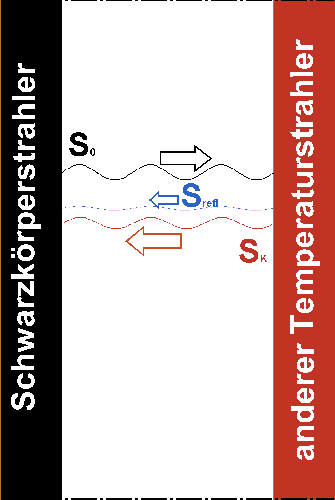 Beweis: Teil 1: Wir nehmen einen beliebigen Körper K, der sich im thermischen Gleichgewicht bei der Temperatur T befindet. Seine Oberfläche kann ohne Beschränkung der Allgemeinheit als unendlich ausgedehnte Ebene angesehen werden. Wir stellen dieser Oberfläche eine ebenfalls unendlich ausgedehnte Ebene eines "Schwarzen Körpers" ebenfalls der Temperatur T gegenüber, und zwar so, dass ein möglicherweise stattfindender Energieaustausch allein über die Strahlung erfolgt (zwischen den Oberflächen ist also Vakuum). Vom Schwarzen Körper wird alle Strahlung SK absorbiert, die vom Körper K ausgeht (das ist die Definition des Schwarzen Körpers). Vom Körper K wird die Strahlung αS0 der Strahlung des Schwarzen Körpers absorbiert. Nun kommt die Voraussetzung ins Spiel: Es herrscht thermodynamisches Gleichgewicht. Daher kann netto nicht mehr Energie in eine der beiden Richtungen übertragen werden; es muss also gelten SK = αS0 zumindest für die Summe aller Strahlung. Daraus erhält man sofort die Gleichheit von Absorptions- und Emissionsgrad. |