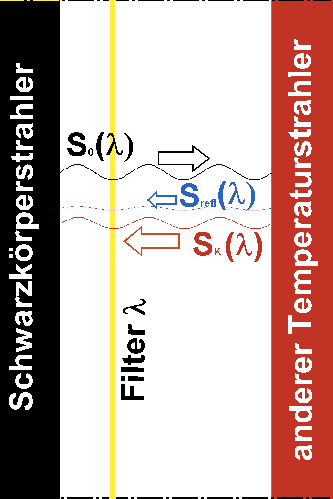 Teil 2: Nun fügen wir in den Strahlengang ein Filter ein, das nur einen schmalen Bereich um die Wellendlänge λ herum durchlässt. Jetzt bestehen die ausgetauschten Strahlungsströme auch nur noch aus der emittierten Strahlung zur Wellenlänge λ des Körpers SK(λ) sowie der absorbierten Schwarzkörper-Strahlung α(λ)S0(λ). Und diese müssen, vgl. die obige Argumentation, gleich sein. Damit haben wir ε (λ) = α(λ), was zu beweisen war.3)