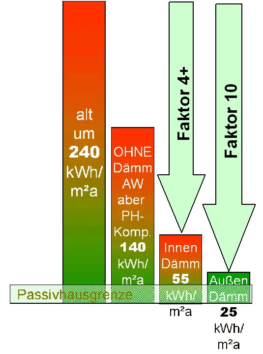 Ganz rechts: Bei konsequenter Sanierung mit Passivhaus