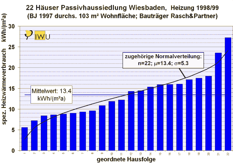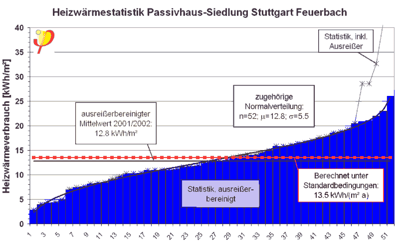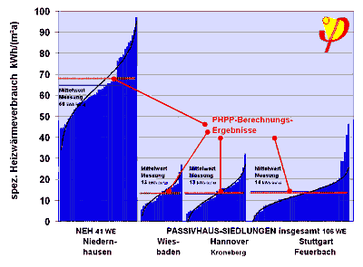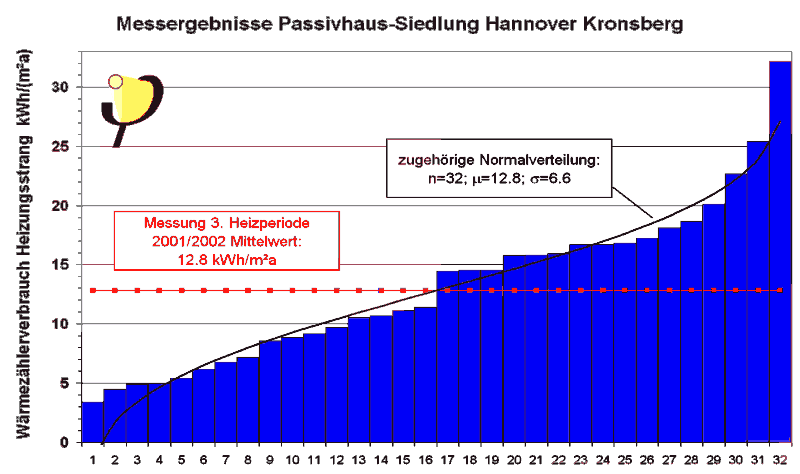 1. Heizperiode 1999/2000: 14,9 kWh/(m²a) 2. Heizperiode 2000/2001: 13,3 kWh/(m²a) 3. Heizperiode 2001/2002: 12,8 kWh/(m²a). Auch für die Passivhaussiedlung Hannover Kronsberg ist der extrem niedrige Heizwärmeverbrauch damit statistisch gesichert - die Standardabweichung der Einzelwerte beträgt 6,6 kWh/(m²a), der Mittelwert ist auf ±1,2 kWh/(m²a) genau bestimmt.