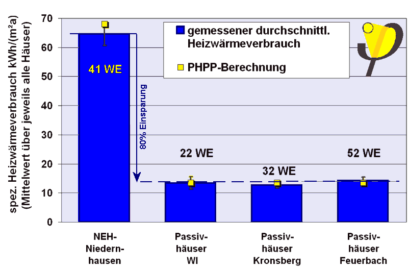 (80% ±5%) Einsparung gegenüber Niedrigenergiestandard, (92% ±1%) Einsparung gegenüber Durchschnittsverbrauch in Deutschland. (Messung Wiesbaden-Dotzheim: [Ebel 2003] ; [Feist/Loga/Großklos 2000]).