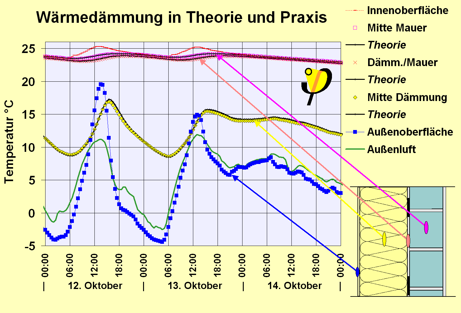 Trotz der beachtlichen Temperaturdifferenz von im Durchschnitt 18,4 Grad zwischen innen und außen kühlt die Wand nicht aus, sondern verbleibt ungefähr auf dem behaglichen inneren Temperaturniveau. Der Wärmeverlust durch die Wand ist extrem gering, er kann allein durch die Wärmegewinne der Fenster in diesem Raum ausgeglichen werden - und das ist der sichtbare Beleg: Wärmedämmung funktioniert. Die Diskussion kann an Hand der Grafik aber noch weiter geführt werden. Dazu wird ein genauerer Blick auf die Temperaturen geworfen, die in der Mauersteinwand selbst gemessen wurden. Das sind drei Kurven, die in der Grafik ziemlich nahe beieinander liegen: In der inneren Putzschicht (ganz oben), in der Mitte der gemauerten Wand und auf der Außenseite der gemauerten Wand (zwischen Styropor und Wand): (b) Die Tatsache, dass alle diese Temperaturen sehr eng nebeneinander liegen, zeigt, dass von der äußeren Mauerwerksoberfläche nicht viel Wärme abfließt: Wäre das der Fall, so müsste diese äußere Oberfläche deutlich kälter sein als die Mitte des Steins oder gar die Innenoberfläche. Stattdessen ist die Außenoberfläche des Steins aber kaum kälter als der Innenputz: Außen liegt die Wand im Mittel bei 23,4 °C, der Innenputz hat im Mittel 24,1 °C. Diese Beobachtung kann sogar für eine ganz grobe Abschätzung eines quantitativen Ergebnisses benutzt werden: Der mittlere Temperaturabfall in der Mauer inklusive Putz beträgt 0,63 Grad, der zwischen Maueraußenoberfläche und Außenputz auf der Dämmschicht 19,4 Grad. Die Wärmedämmwirkung der Dämmschicht ist daher um einen Faktor 19,4/0,63 ≈ 31 höher als die der Mauersteinwand. Das ist sogar etwas besser als das theoretische Ergebnis von etwa 28,5, das mit einer einfachen U-Wert-Berechnung herauskommt: Die "Wärmedämmwirkung", das ist in der Bauphysik der Wärmedurchlasswiderstand. Der ergibt sich aus der Dicke der jeweiligen Bauteilschicht geteilt durch ihre Wärmeleitfähigkeit. Die bewusst als "grobe Abschätzung" bezeichnete Berechnung des Faktors 31 wäre nur dann exakt, wenn die Temperaturen im Bauteil am Anfang und am Ende der Zeitperiode exakt gleich wären. Das ist hier nicht der Fall. Um eine genauere Berechnung zu erhalten, muss ein sehr viel längerer Zeitraum betrachtet werden: Dann spielen die Veränderungen zwischen Anfangs- und Endzeitpunkt eine kleinere Rolle. Trotzdem liefert diese grobe Betrachtung einen weiteren Beleg: Wärmedämmung funktioniert sogar sehr gut, die abfließende Wärmemenge durch die Dämmung ist sehr klein, die Dämmwirkung der Wärmedämmung um ein Vielfaches höher als die der Mauersteinwand. (c) Die grobe Abschätzung unter (b) hatte den Makel, dass sie instationäre Effekte nicht berücksichtigt hat. Das ist nur zulässig, wenn über einen sehr langen Zeitraum gemittelt wird - drei Tage sind dafür im vorliegenden Fall etwas kurz. Mit den eingeführten Methoden der Bauphysik können wir diesen Makel aber vollständig beseitigen: Es kann nämlich völlig korrekt nach der instationären Wärmeleitungsgleichung (oder Fourier'schen Differentialgleichung) gerechnet werden. Diese genauere Berechnungsmethode haben wir (immer schon) bei allen wissenschaftlichen Auswertungen verwendet. Die Berechnungsergebnisse, die sich nach der instationären Wärmeleitungsgleichung ergeben, sind in der oben gezeigten Grafik bereits eingezeichnet (!): Es handelt sich um die durchgehenden schwarzen Kurven, die jeweils sehr nahe an den Messwerten entlang verlaufen; sie laufen so nahe an den Messwerten entlang, dass es schwer ist, in der oberen Grafik überhaupt einen Unterschied zu erkennen. Wer die Unterschiede erkennen möchte, kann durch Klick auf die Grafik eine besser aufgelöste Version herunterladen: Auf dieser kann man immerhin am Messpunkt im Inneren der Dämmschicht um 15:30 des 12. Oktobers eine maximale Abweichung von etwa 0,25 °C erkennen. Das liegt im Rahmen der Genauigkeit, mit der diese Messungen durchgeführt werden können. Das Ergebnis des Vergleichs zwischen bauphysikalischer Theorie (schwarze Kurven) und gemessener Praxis (farbige Symbole) ist ganz eindeutig: Bei der hier messtechnisch untersuchten Wandkonstruktion stimmen Theorie und Praxis sehr gut überein. Daraus ergibt sich ein großes Vertrauen in die bauphysikalischen Methoden. Auch nach dem korrekt durchgeführten Vergleich (c) von Messung und Berechnung ergibt sich ganz eindeutig: Die Wärmedämmung funktioniert. Und sie leistet exakt das nach den Methoden der Bauphysik von ihr Erwartete: Unter anderem spart sie im hier vorliegenden Fall sehr viel Heizenergie ein. (zu einer Ergänzung mit "Lupendarstellung" zur oberen Grafik)