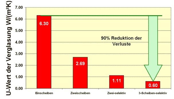 der Einscheibenverglasung ergeben sich über 90% Energieeinsparung.
