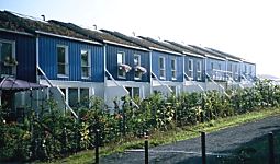 ...sie lebt mit ihrem Mann ... und Sohn ... in einem der 32 Reihen-"Passivhäuser§ (195 000 €) in der Siedlung Lummerland am Kronsberg. ' Quelle: C. Jacob-Rüdiger, Bild Hannover vom 16. März 2000 Foto links: Ansicht der Passivhaussiedlung in Hannover. Foto PHI. |
